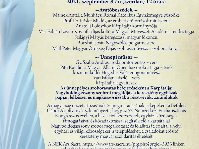 Miskolcról is indul kisbusz 7 órakor a Centrum parkolójából (a szokott helyről) Nagyszőlősre a Nagyboldogasszony szobor avatására. Az autóbuszt a CÖF Klub Lengyel Attila biztosítja. Köszönet érte.